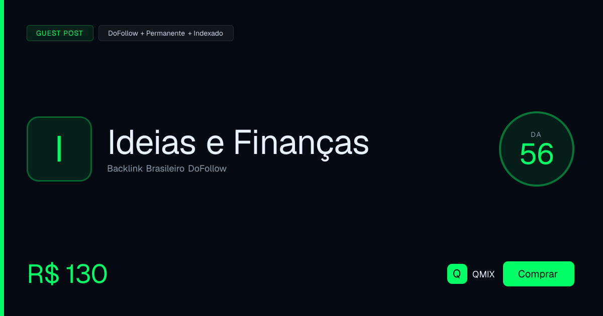 Backlink dofollow permanente publicado no portal Ideias e Finanças. Conteúdo original, indexação garantida pelo Google e entrega em até 7 dias úteis.