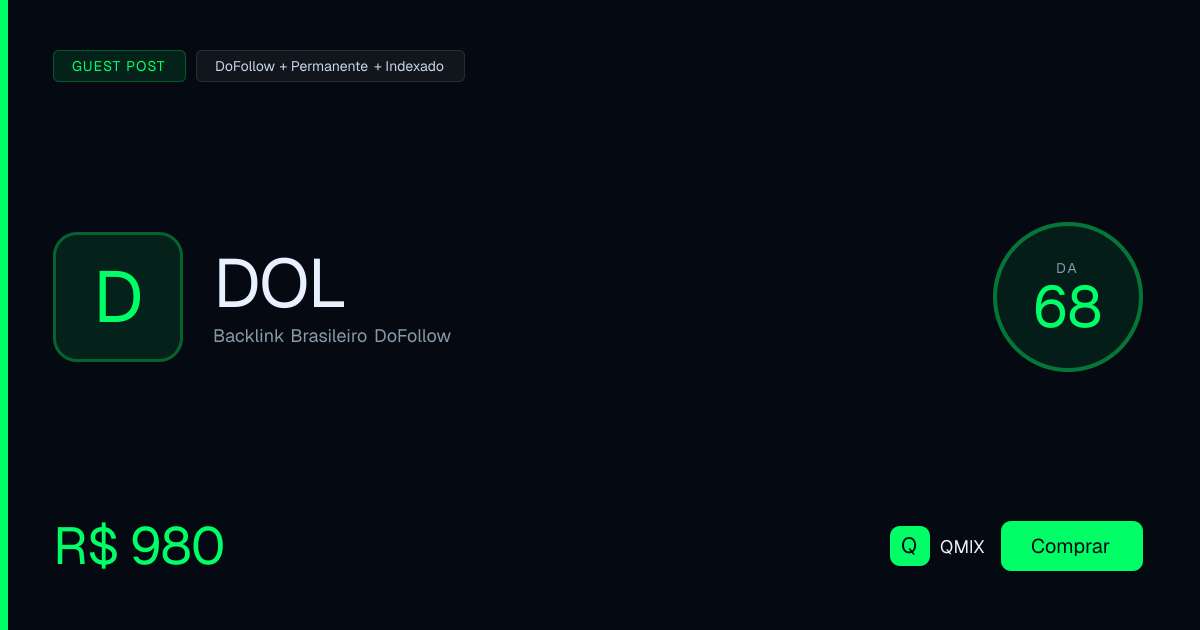 Publicar um guest post no DOL significa inserir o conteúdo em um portal de notícias com conteúdo variado e contexto editorial real. O site tem DA 68 (Moz) e tráfego estimado de 2.8 milhão de visitas/mês (SimilarWeb), o que indica boa visibilidade potencial. Além disso, o backlink é dofollow e sem tag sponsored, o que o torna um ativo relevante dentro de uma estratégia de SEO.